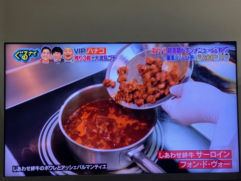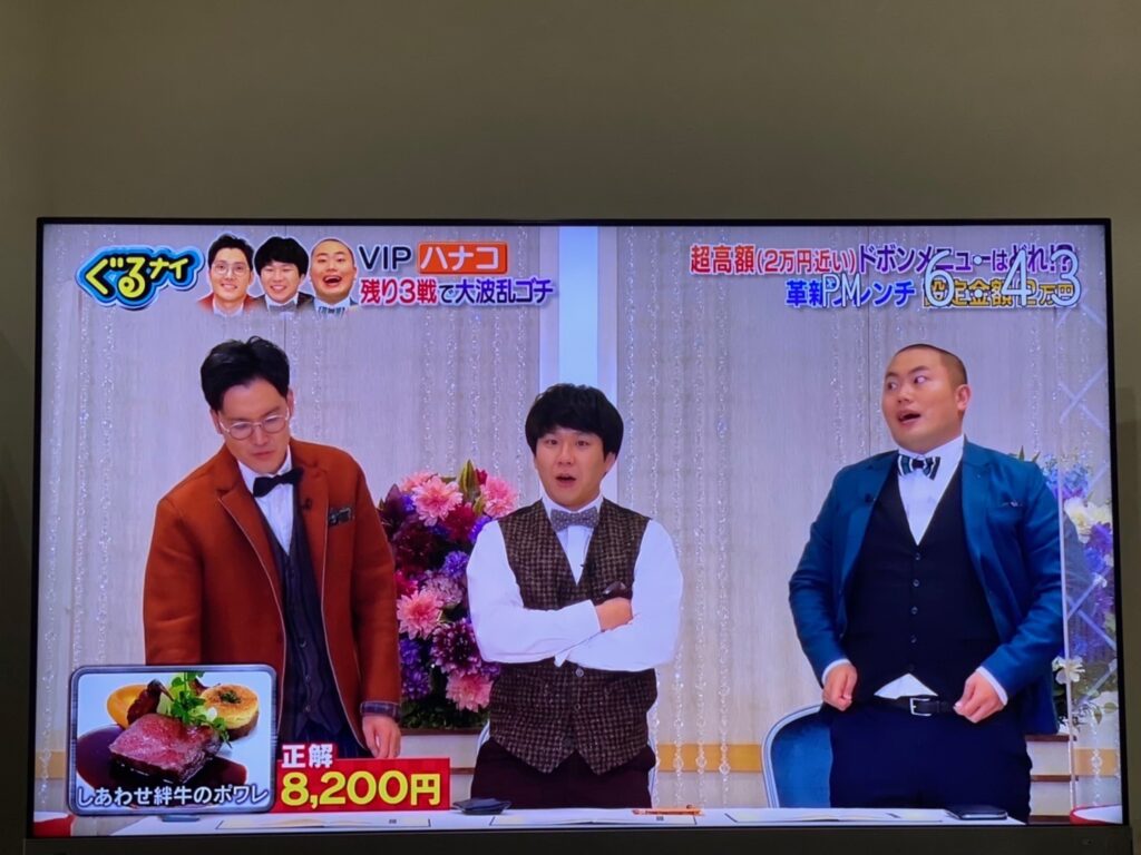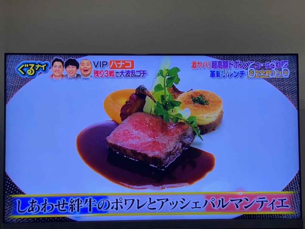渋谷の街を一望できる高級感溢れるラグジュアリーな本格フレンチレストランでお笑い芸人「ハナコ」の3名にしあわせ絆牛のポワレとアッシェパルマンティエを食べていただきました。