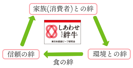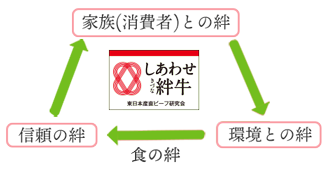 「しあわせ牛シリーズ」は、「家族」(消費者)・「環境」(生産地)・「信頼」(生産者)との絆で結ばれています。